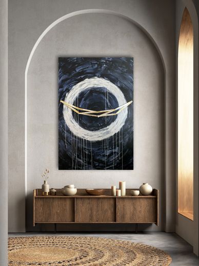 Gradations take on the form of calibrations, moving in and out to offset each other in a search for balance. The speckled raw canvas brings an element of earthiness and grounding. Each artwork is wired to hang either vertically or horizontally.